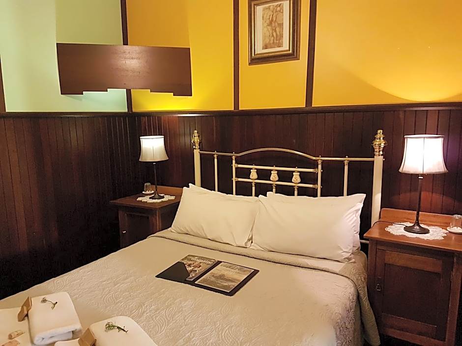 Located within the original post-Victorian guest house, these Queen Courtyard Rooms offer a character-rich stay at the heart of a local historic site. Each room features a private private bathroom, a classic brass Queen bed, timber floors, and modern comforts including reverse-cycle air-conditioning, Wi-Fi, and tea and coffee facilities. On entry, is a shared seating area with amenities, furnished with antiques and memorabilia.